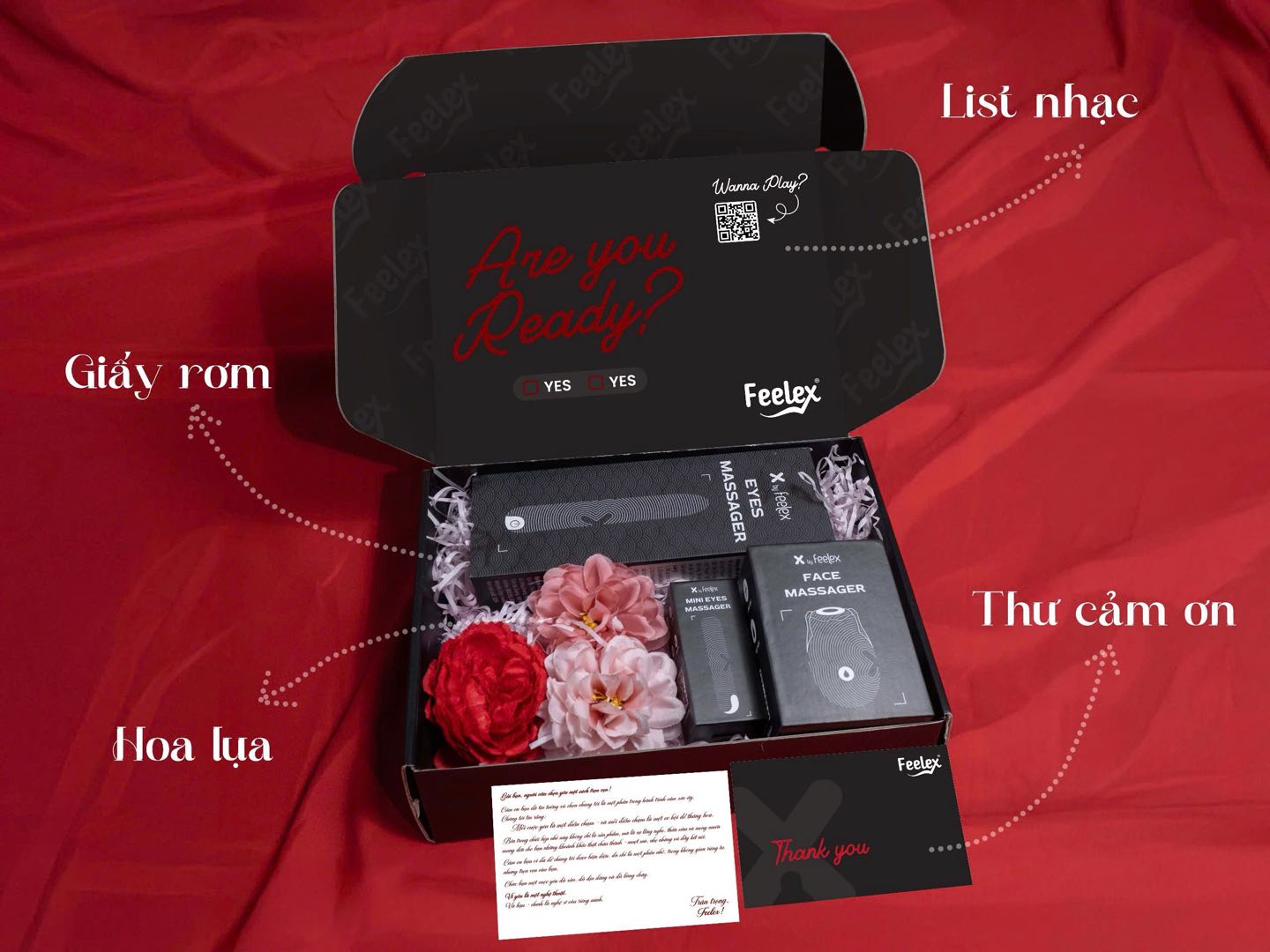 Giấy rơm trắng, hoa lụa đỏ và thư cảm ơn – tạo cảm giác như bạn đang được ai đó chuẩn bị món quà yêu thương thực sự.